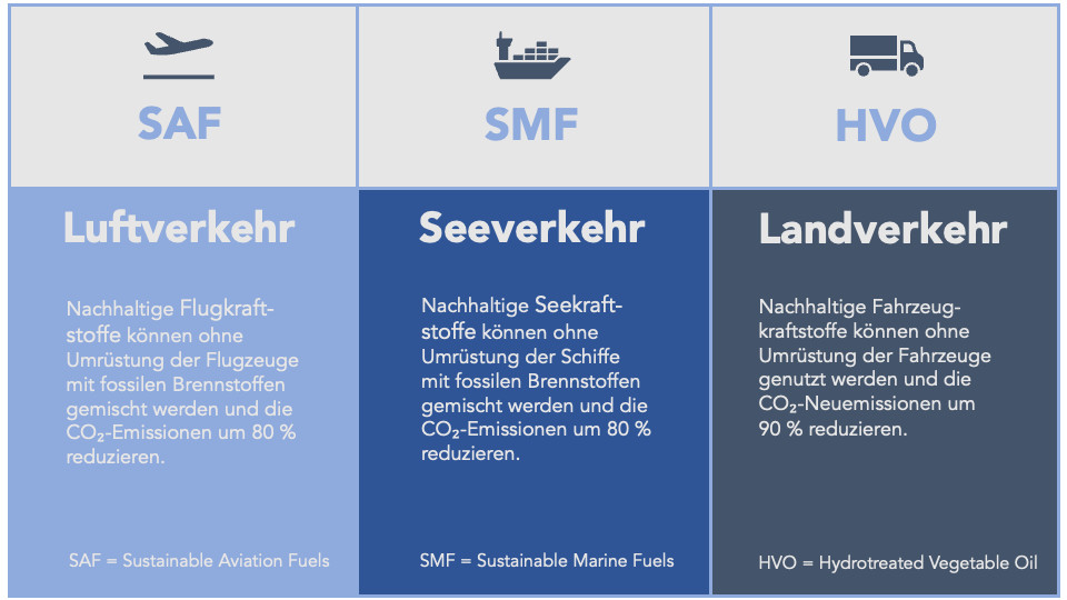 Biokraftstoff aus nachhaltigem Anbau ist der strategisch sinnvolle Ansatz zum Klimaschutz. Voraussetzung: Er darf keine negativen Auswirkungen auf Umwelt, Klima oder Gesellschaft haben. Er kann ohne Umwandlung als Drop-in-Kraftstoff im Luft-, See- und Straßenverkehr eingesetzt werden. Seine Vorteile sind vielfältig, so ist er biologisch abbaubar, weitaus weniger giftig als fossile Kraftstoffe und reduziert sowohl CO₂-Emissionen als auch lokale Luftschadstoffemissionen.